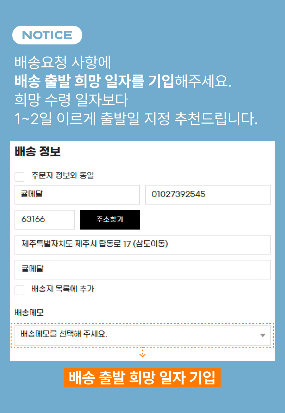 배송출발 희망일 미기재시 변경이 어렵습니다.