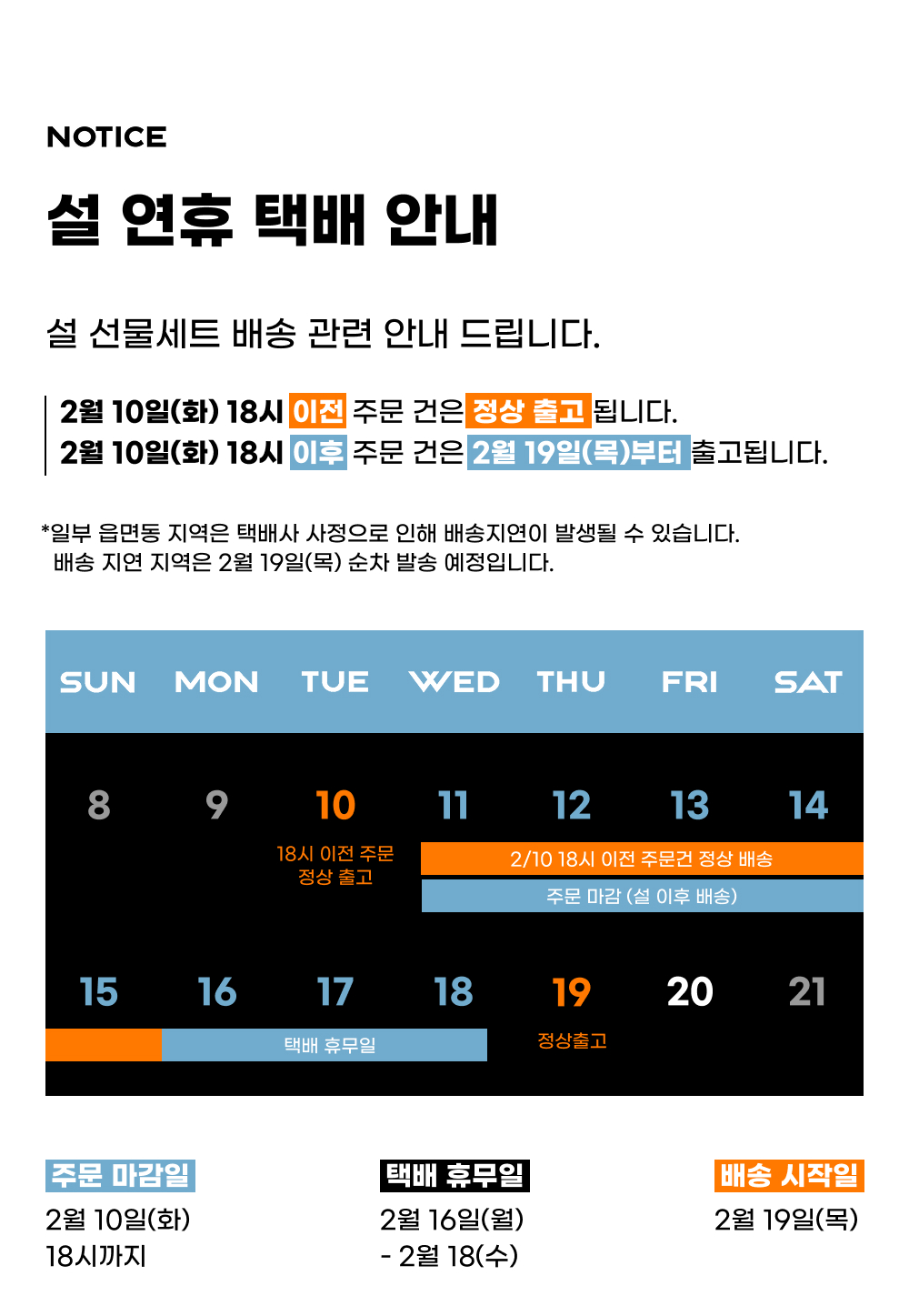 ※2월 10일(화) 18시 이전 주문 건은 정상 출고되어 설 전 주말까지 배송됩니다.