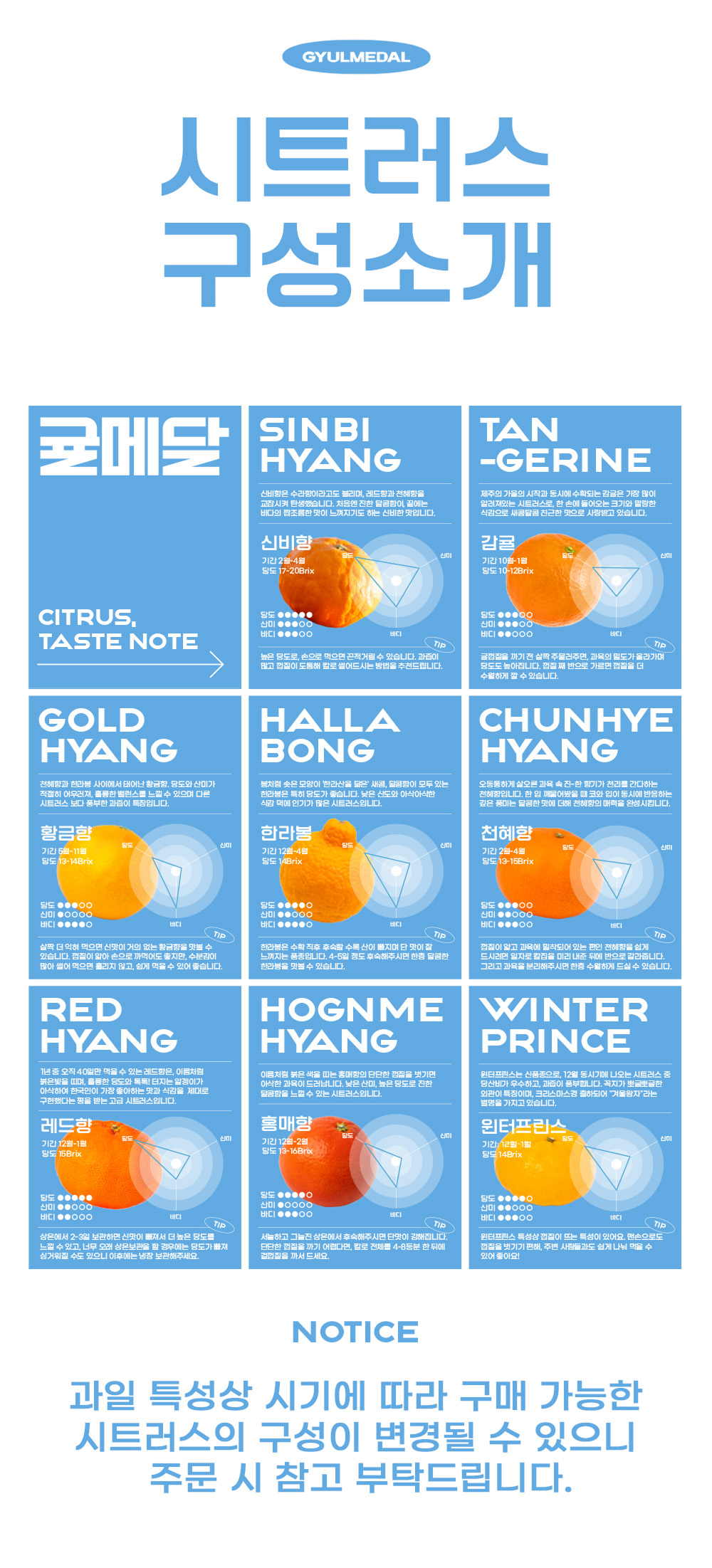 귤 취향 키트는 다양한 시트러스를 한 개씩 맛볼 수 있는 샘플러 상품입니다.